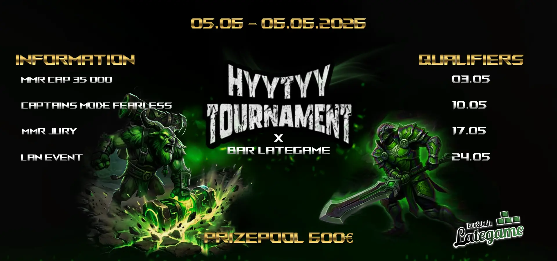 Nyt on aika kerätä tiimi kasaan ja lähteä tavoittelemaan voittoa Tampereen Bar Lategameen! Turnaus huipentuu kesäkuun alussa järjestettävään LAN-tapahtumaan.